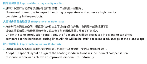 充分利用車間高度空間,垂直固化爐相比較水平運輸的固化線,在同等的產能情況下將設備占地面積大幅度縮小;